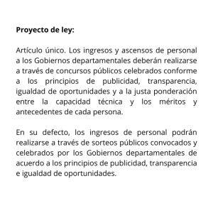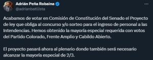 El senador colorado Adrián Peña, impulsor del proyecto, expresó: «Acabamos de votar en la Comisión de Constitución del Senado el Proyecto de ley que obliga al concurso y/o sorteo para el ingreso de personal a las Intendencias. Hemos obtenido la mayoría especial requerida con votos del Partido Colorado, Frente Amplio y Cabildo Abierto. El proyecto pasará ahora al plenario donde también será necesario alcanzar la mayoría especial de 2/3»